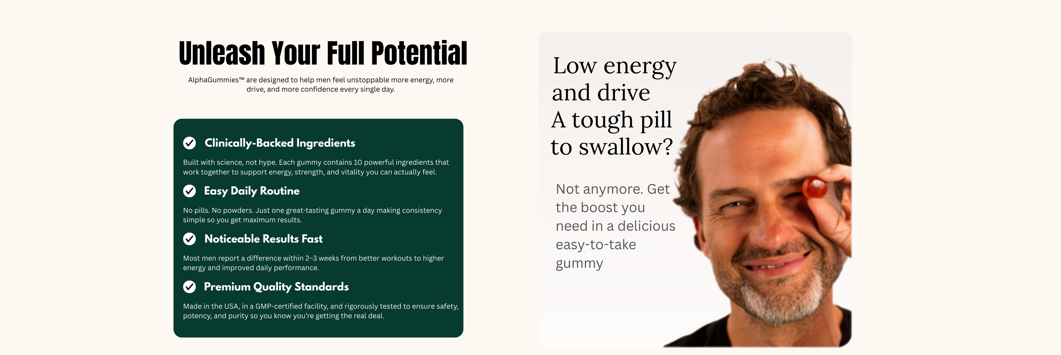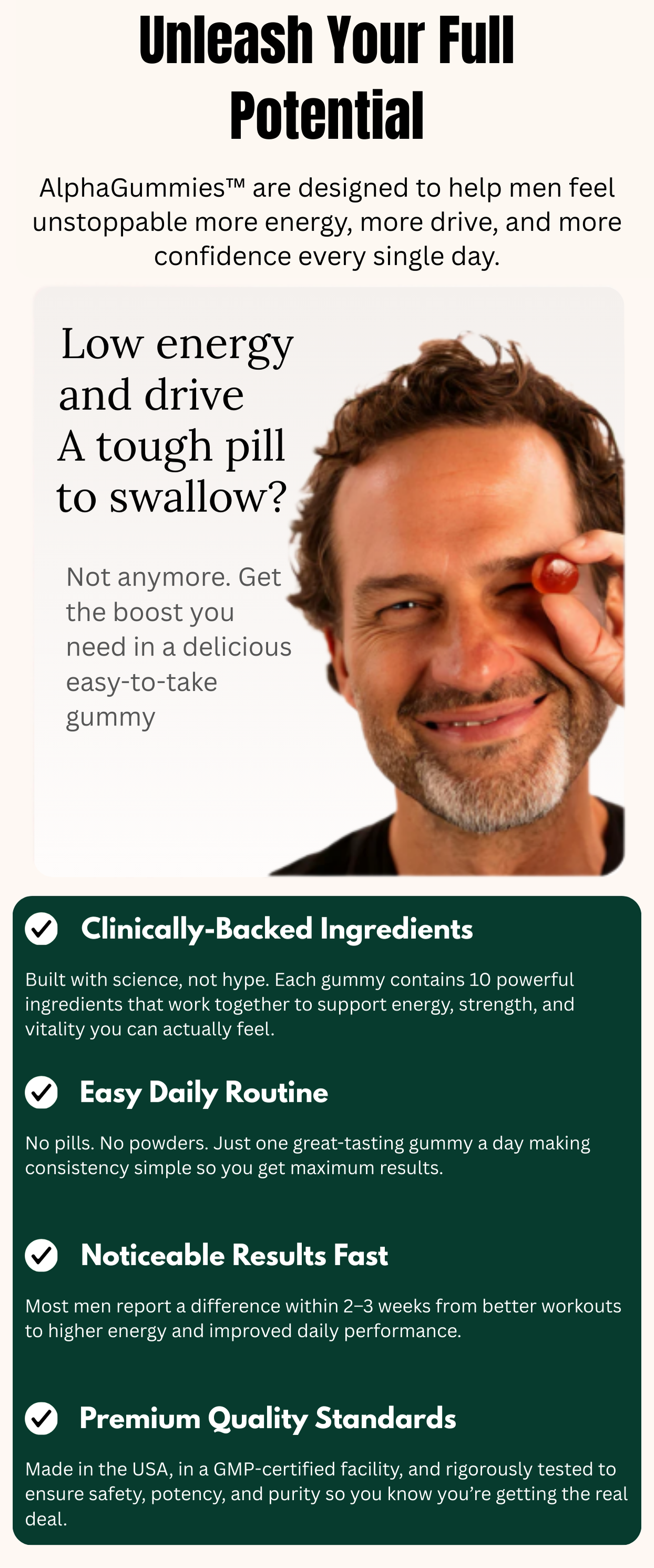 After 40, it’s normal to feel your energy and drive dip but it doesn’t have to. AlphaGummies™ packs 10 powerful ingredients to help men restore strength, stamina, and focus, so you can feel and perform like you did years ago.